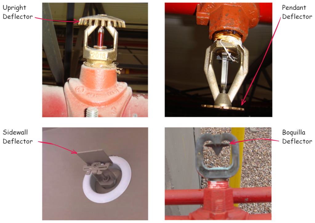 Observen con detenimiento los dos primeros rociadores (upright y pendant). El deflector es la parte más alejada del npt del rociador. El deflector para un rociador upright es como un sombrero de palma que utilizan los danzantes de la danza de los viejitos. El deflector del rociador pendant es recto como una moneda.