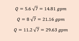 El dato del flujo se puede determinar como en la fórmula de arriba cuando contamos con el factor k y la presión. Recordemos que la presión de operación mínima por NFPA 13 es de 7 psi. Ejemplos: